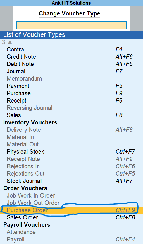 After click here you see more vouchers now select Purchase Order Voucher CTRL + F9